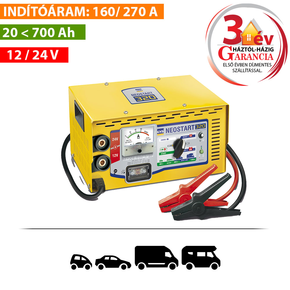 A Neostart 320 készülék folyékony elektrolittal töltött 20 Ah - 700 Ah kapacitású, 12 V-os és 24 V-os ólomakkumulátorok töltésére alkalmas. Ez a készülék hagyományos akkumulátortöltő, a feltöltöttségi szintet figyelni kell rajta.